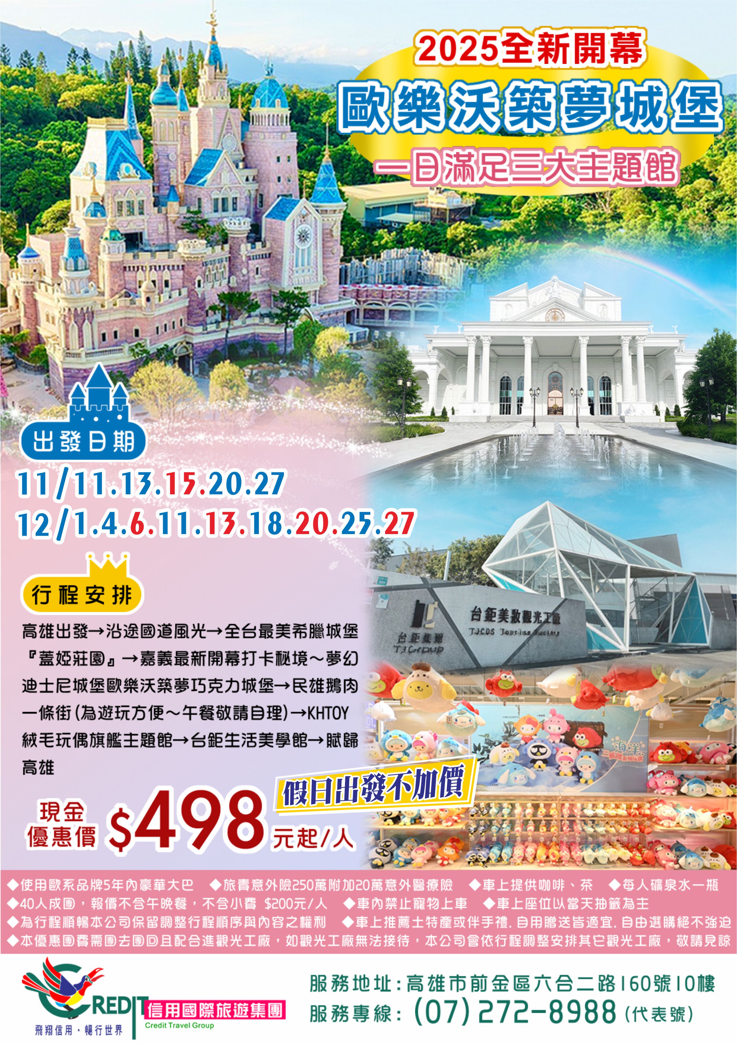 早上06:50高雄出發 ➜ 沿途國道風光 ➜ 全台最美希臘城堡『蓋婭莊園』➜ 嘉義最新開幕打卡秘境~夢幻迪士尼城堡歐樂沃築夢巧克力城堡 ➜ 民雄鵝肉一條街(為遊玩方便,午餐敬請自理) ➜ KHTOY絨毛玩偶旗艦主題館 ➜ 台鉅生活美學館 ➜ 賦歸高雄