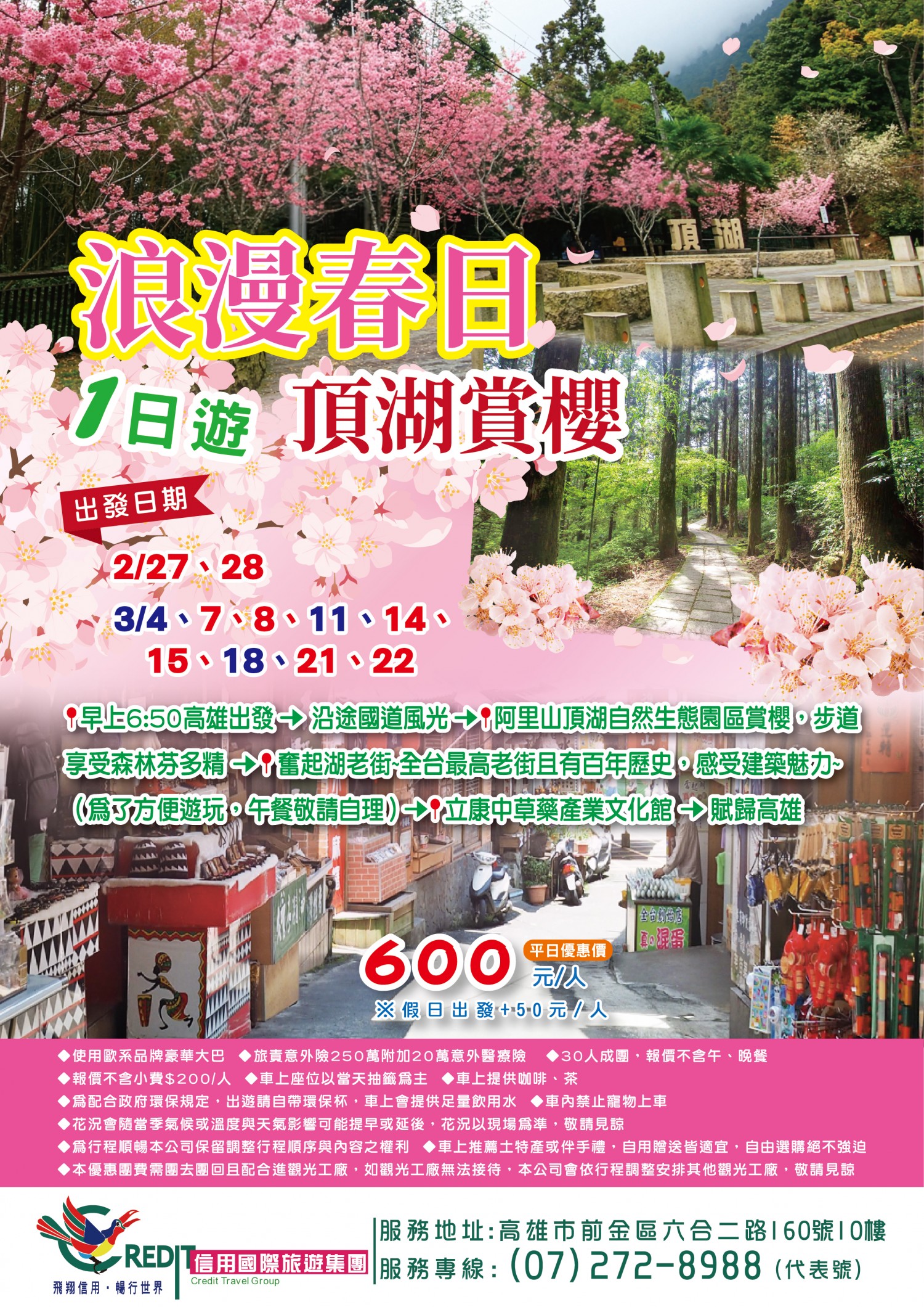 2026迎春特輯 2晚入住希爾頓酒店 高雄出發 | 2026迎新春3日。麗池公園櫻花盛開 $6,800起 more 優惠行程席次有限 高雄出發|金馬祈福財運到2日 | 竹山紫南宮求財運 | 日月潭湖光山色 $1,980起 more 梅山公園賞梅、朝天宮祈福 高雄出發 | 賞花祈福馬迎春--嘉義1日 $588起 more 與百萬隻紫斑蝶來場一期一會的相遇 高雄出發|茂林森呼吸、台版小長城1日 $488起 more