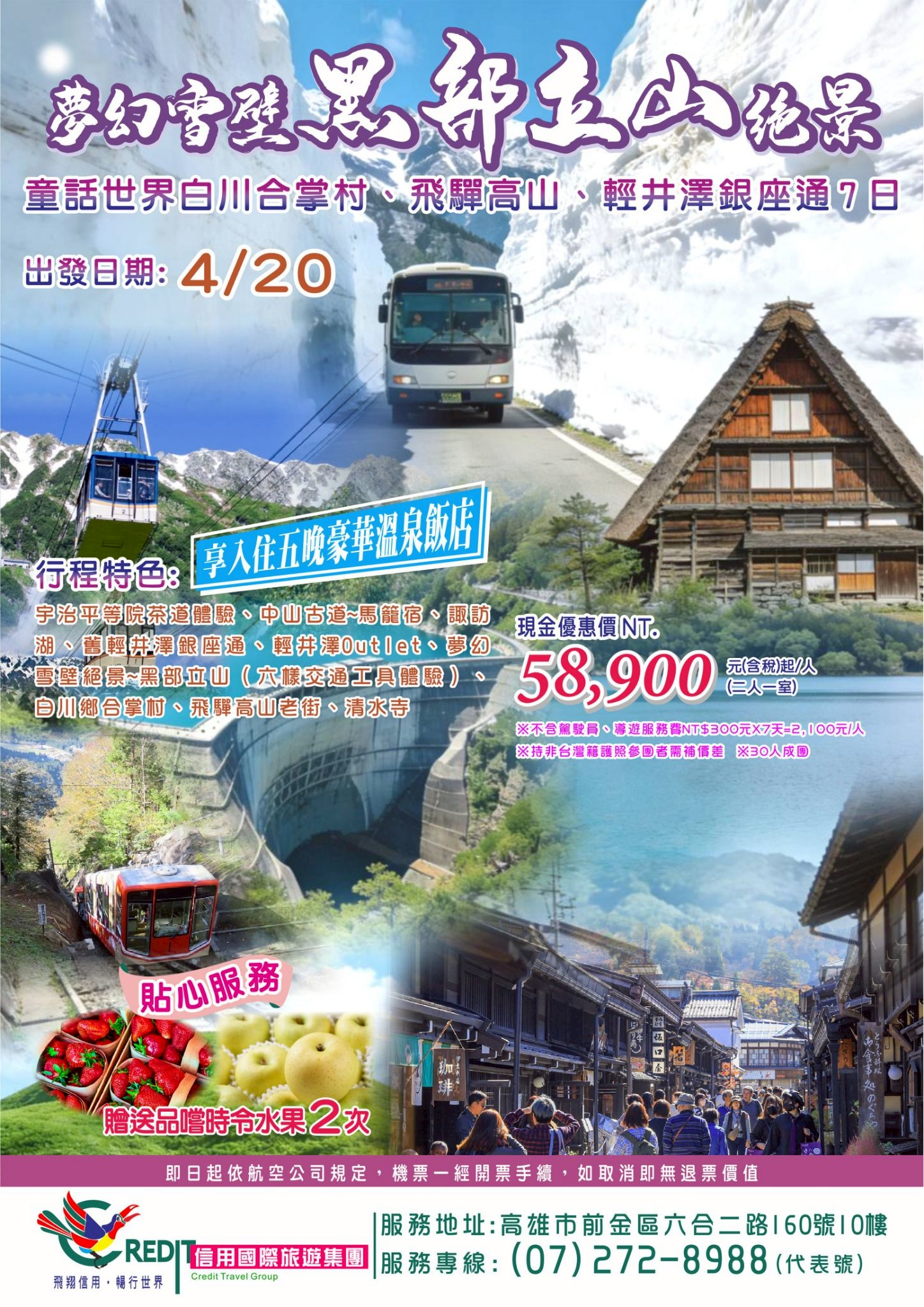 精選旅遊行程 日本北陸7日 【高雄出發】夢幻雪壁絕景~黑部立山、童話世界白川合掌村北陸七日 夢幻雪壁絕景~黑部立山、童話世界~白川合掌村 飛驒高山、輕井澤散策、日本北陸 $58,900起 more 一日遊 浪漫春日頂湖賞櫻一日遊 頂湖生態園區、奮起湖老街一日遊 $600起 more 四川8日遊 【高雄出發】成都、九寨溝、四姑娘山、黃龍風景區、 松潘古城、船遊樂山大佛、都江堰 八日 九寨溝仙境、成都古城尋幽 $47,800起 more 屏東一日遊 【高雄出發】茂林賞蝶季 紫蝶幽谷&山中傳奇 $880起 more 屏東一日遊 【高雄出發】墾丁台版小奈良 可愛梅花鹿&呆萌的水豚君、懷舊小旅 $650起 more 嘉義一日遊 【高雄出發】來嘉賞梅、好拍希臘式風情 梅山花開正盛 $780起 more 六日遊 【高雄出發】藏王樹冰 百萬雪怪絕景 冬季限定|特別贈送雪上摩托車、香蕉船 $46,800起 more 五日遊 【高雄出發】冬季戀情 六甲山雪樂園 京都米其林景點|六甲山嬉雪樂趣|長腳蟹吃到飽 $29,800起 more